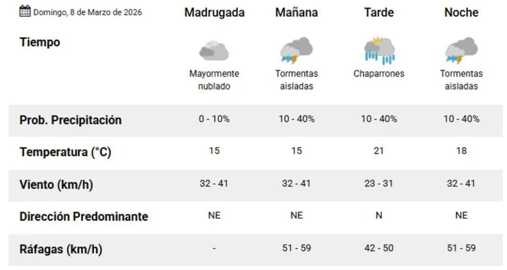 En la segunda mitad del domingo, se prevén chaparrones con una temperatura máxima estimada en 21 grados. Las ráfagas de viento se mantendrán presentes durante todo el día, fluctuando entre los 42 y 59 kilómetros por hora según la franja horaria.