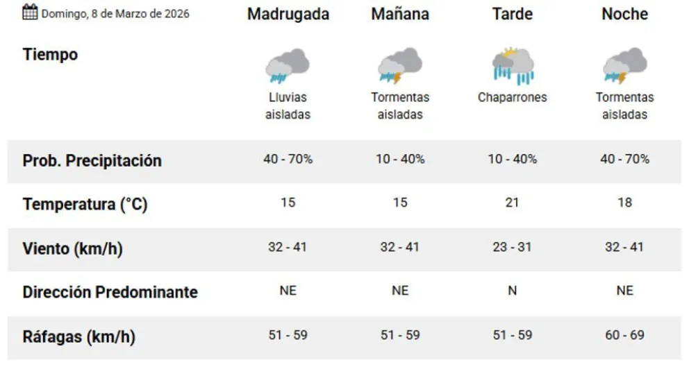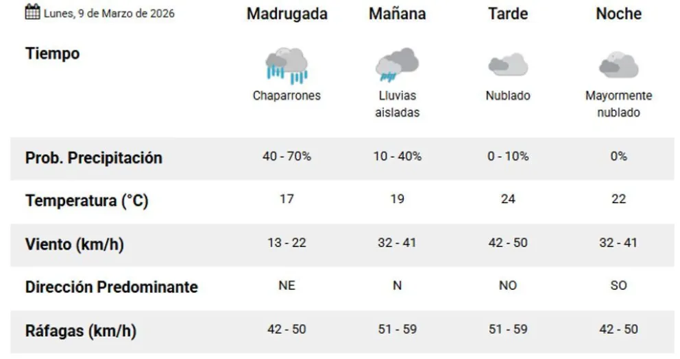 Para el lunes 9 de marzo, las previsiones indican una temperatura mínima de 17 grados y una máxima de 24 grados. La primera mitad del día estará marcada por chaparrones y lluvias aisladas, con ráfagas iniciales de 50 kilómetros por hora que luego se intensificarán.