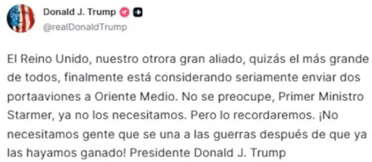 El mandatario republicano utilizó su cuenta en Truth Social para manifestar su descontento con la gestión del gobierno del Reino Unido. "El Reino Unido, nuestro otrora gran aliado, quizás el más grande de todos, finalmente está considerando seriamente enviar dos portaaviones a Oriente Medio. No se preocupe, Primer Ministro Starmer, ya no los necesitamos. Pero lo recordaremos. ¡No necesitamos gente que se una a las guerras después de que ya las hayamos ganado!", sentenció.