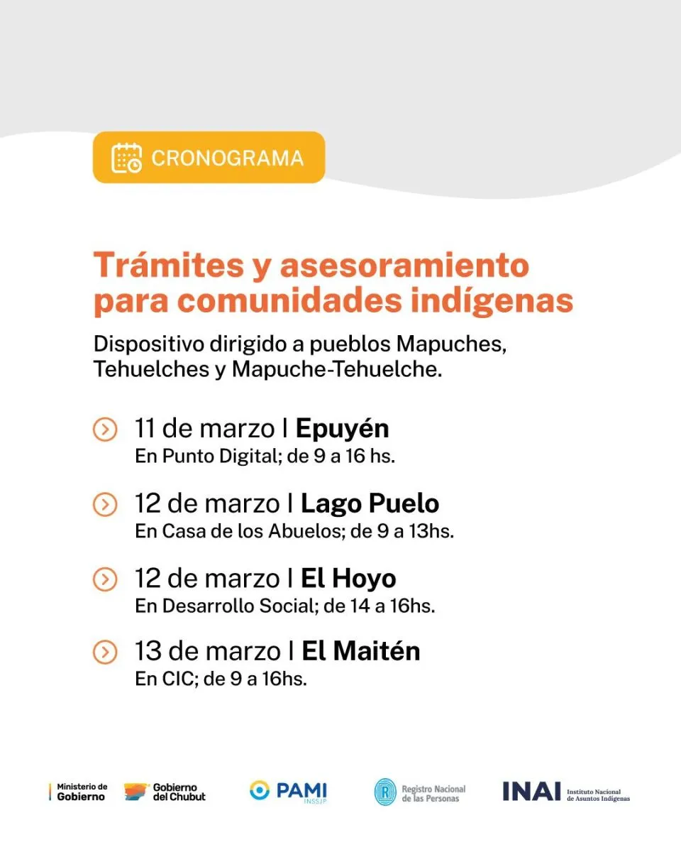 Posteriormente, el jueves 12 de marzo las actividades continuarán en Lago Puelo, de 9 a 13 horas en el SUM de la Casa de los Abuelos, y ese mismo día por la tarde el equipo se trasladará a El Hoyo, donde se atenderá de 14 a 16 horas en la Oficina de Desarrollo Social.
