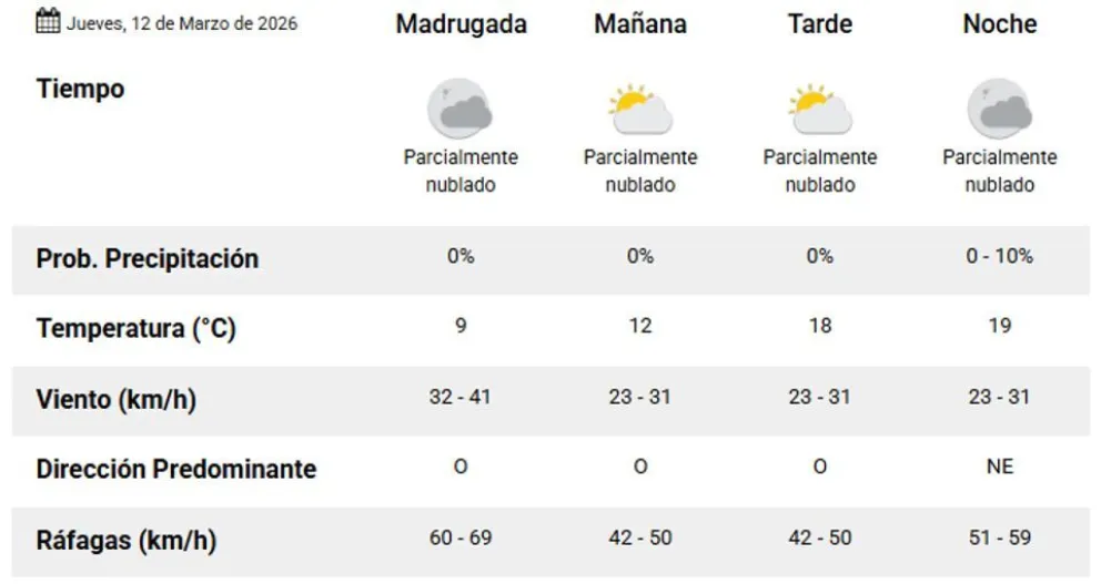 Durante las primeras horas del jueves se registrará una temperatura mínima de 9°. El cielo permanecerá parcialmente nublado con vientos del sector oeste. Se prevén ráfagas que oscilarán entre los 60 y 69 kilómetros por hora.