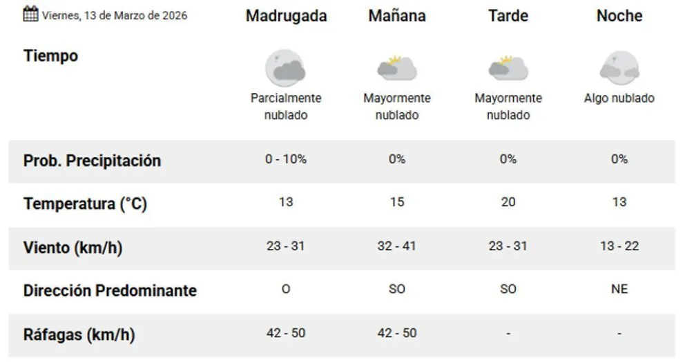 Para el viernes 13 de marzo se prevé una temperatura mínima de 13° y una máxima de 20°. La madrugada iniciará con cielo despejado, aunque la nubosidad aumentará considerablemente durante la mañana y la tarde.