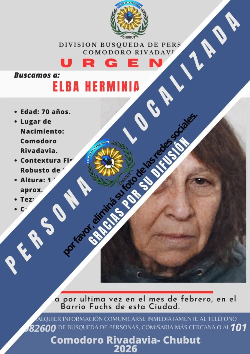 La División Búsqueda de Personas de Comodoro Rivadavia informó oficialmente que se dejó sin efecto el protocolo de localización de Elba Herminia Álvarez. La mujer era buscada por las autoridades locales tras las actuaciones iniciadas recientemente.