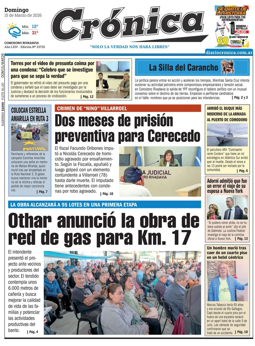 Actualidad Domingo 15 de marzo de 2026 domingo 15 de marzo de 2026 Te puede interesar Torres sobre el video de la presunta coima: “Celebro que se investigue para que se sepa la verdad” Quién era el hombre que murió tras caer al vacío en un edificio de Comodoro Adorni admitió que fue un error el viaje de su esposa a Nueva York: “Si pudiera volver atrás, no se hubiera subido al avión” Dos escaladores completaron en libre el Pilar Este del Fitz Roy y lograron un hito en el Cerro Chaltén Osvaldo Giordano: “La reforma laboral es importante, pero por sí sola no alcanza” Venezuela pidió a Estados Unidos que levante las sanciones económicas Estados Unidos volvió a respaldar a la Argentina en el juicio por la expropiación de YPF Últimas noticias La política parece entrar en acción y aceleran los tiempos Los Pumas 7’s avanzaron a semifinales por el Oro Ameghino festejó en el clásico con mucho para corregir Los promocionales siguen con la acción Comienza el torneo femenino de Primera