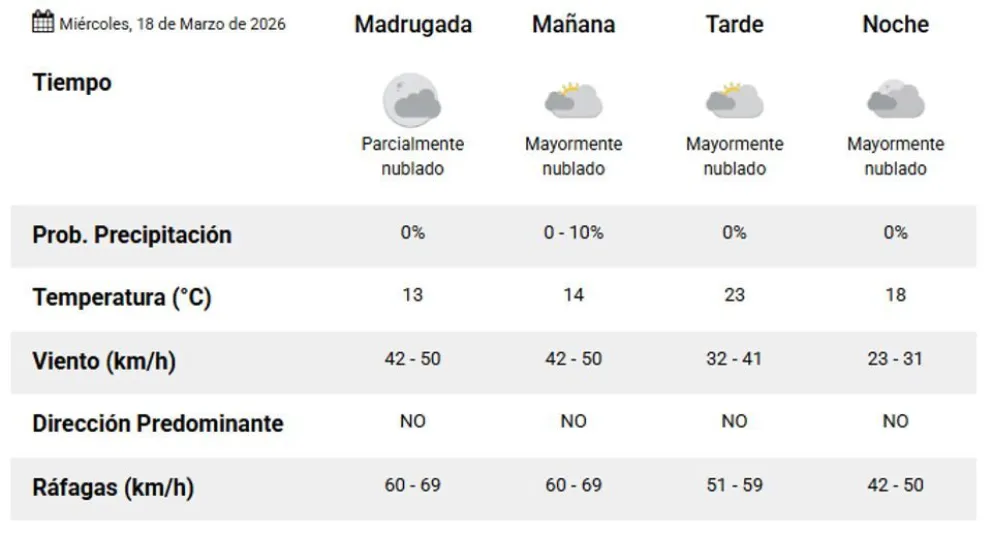 Durante la noche se prevé cielo mayormente nublado sin probabilidad de lluvias. Las ráfagas de viento se ubicarán entre los 51 y 59 km/h.