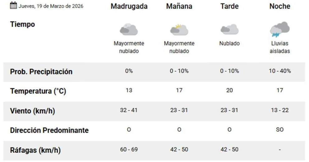 Para la tarde y la noche se prevén lluvias aisladas con una probabilidad de entre el 10% y el 40%. Las ráfagas de viento alcanzarán los 78 km/h en las primeras horas.