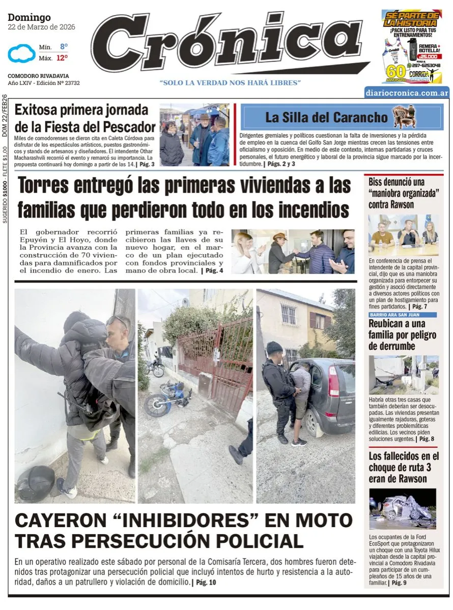 Actualidad Domingo 22 de marzo de 2026 domingo 22 de marzo de 2026 Te puede interesar El Gobierno avanza en la instalación de la Subestación del Hospital Santa Teresita Chubut puso en marcha el Plan Calor 2026 Torres entregó las primeras viviendas a familias que perdieron todo en los incendios de la Comarca Andina Exitosa primera jornada de la Fiesta del Pescador Exclusivo de Crónica: así fue la despedida de Cherquis Bialo Ataques iraníes en Israel: 87 heridos en Arad y Dimona Diputados provinciales quieren precisiones sobre los recursos de seguridad en Comodoro y Trelew Últimas noticias Gimnasia, por un triunfo para afirmarse en el tercer lugar Alerta: empezaron a aparecer billetes falsos en Trelew El Gobierno avanza en la instalación de la Subestación del Hospital Santa Teresita Chubut puso en marcha el Plan Calor 2026 Resultados y posiciones
