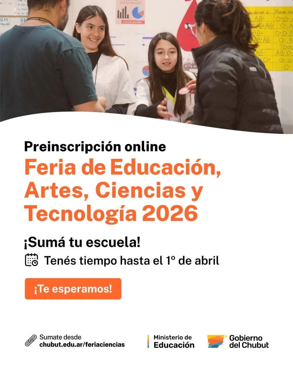 El Gobierno del Chubut, a través del Ministerio de Educación, informa que se encuentra abierta la preinscripción online para los proyectos que participarán de la Instancia Escolar de la Feria de Educación, Artes, Ciencias y Tecnología 2026.
