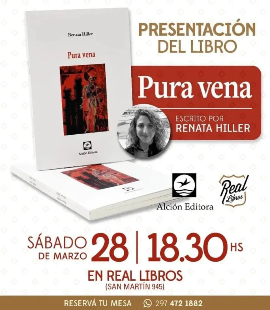 El sábado a las 18:30 horas, la librería Real Libros (San Martín 945) abrirá sus puertas para la presentación de “Pura vena”, el debut poético de Renata Hiller.