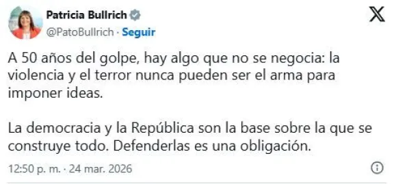 En el marco de los 50 años del último golpe de Estado, la senadora Patricia Bullrich publicó un mensaje en sus redes sociales en referencia al 24 de marzo, con un llamado a defender los valores democráticos.