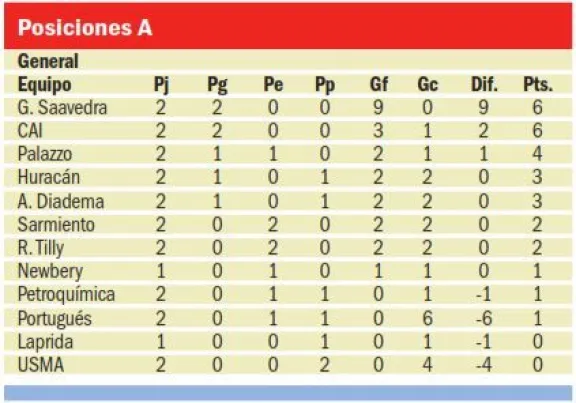 La segunda fecha del Apertura comenzó a disputarse el domingo y dejó a dos equipos en lo más alto de la tabla con puntaje ideal. General Saavedra obtuvo una contundente victoria como visitante frente a Deportivo Portugués, mientras que CAI se impuso por 1-0 ante Argentinos Diadema en el barrio km 27.