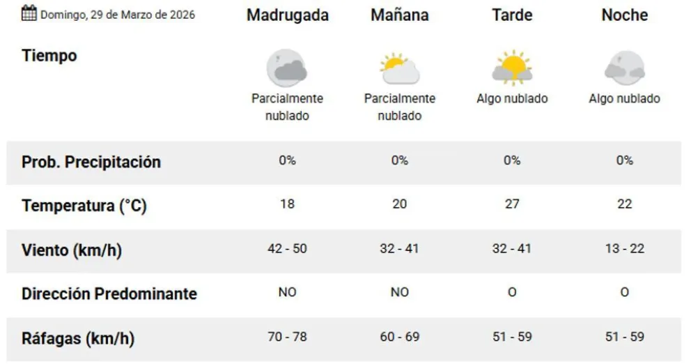 El viento será el factor predominante durante el inicio del domingo. Se estiman ráfagas que alcanzarán velocidades de entre 70 y 78 kilómetros por hora durante la madrugada, con una disminución progresiva hacia el resto de la jornada.
