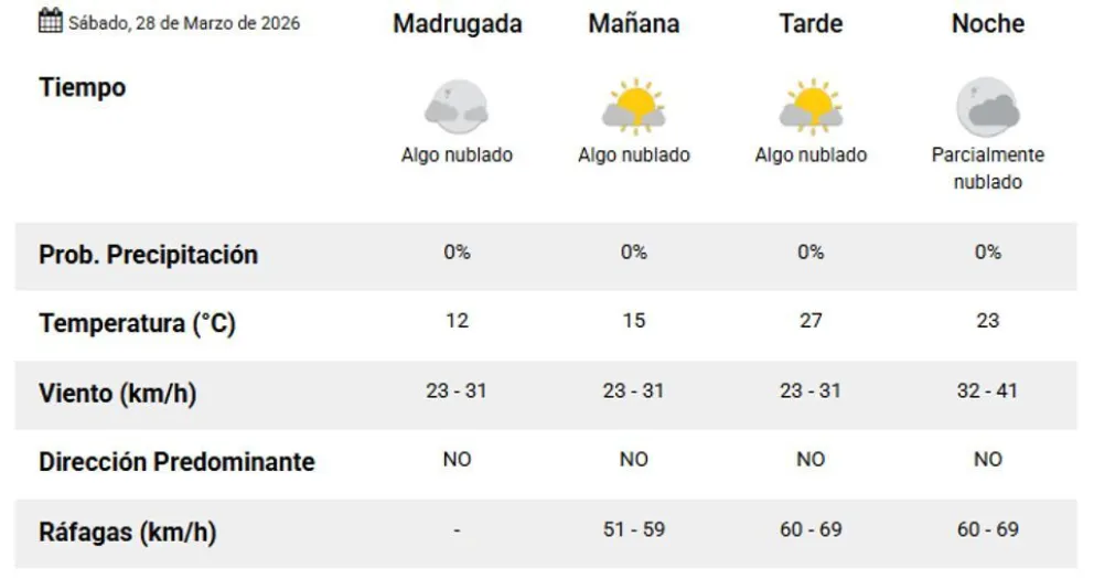 Durante la madrugada, la temperatura mínima se ubicará en los 12 grados. Por la tarde, el termómetro alcanzará una máxima de 27 grados, registrándose ráfagas de viento del noroeste que podrían oscilar entre los 60 y 69 kilómetros por hora.