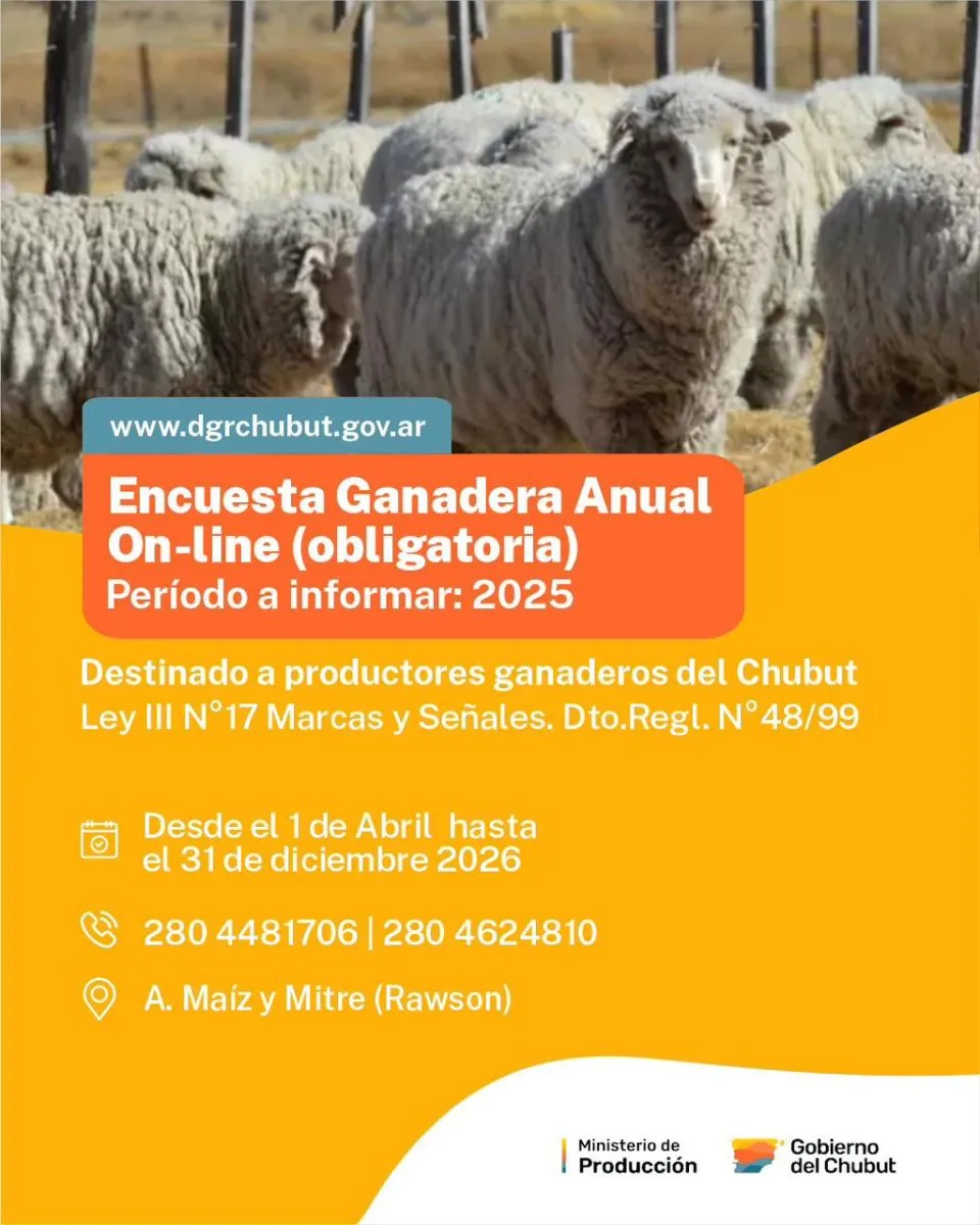 El Gobierno del Chubut, a través del Ministerio de Producción, convoca a productores de la provincia a realizar la Encuesta Ganadera Anual Obligatoria 2025. El período para completarla inicia el miércoles 1 de abril y se extiende hasta el 31 de diciembre de 2026.
