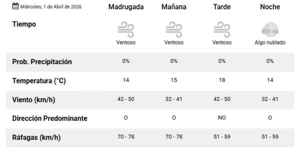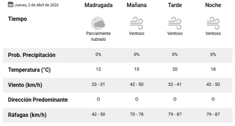 Se prevén ráfagas que oscilarán entre los 70 y 78 kilómetros por hora durante la mañana. Estas condiciones podrían intensificarse hacia la tarde y noche, alcanzando valores de entre 79 y 87 kilómetros por hora.