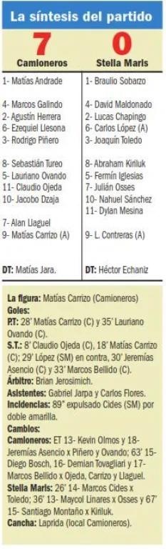 Las diferencias quedaron todavía más claras en el complemento. Camioneros mandó a jugar a Jeremías Asencio arriba y a Olmos para cerrar un trío defensivo. Lo que le quedaba a Stella Maris se diluyó rápidamente. Primero apareció Ojeda para resolver una maniobra colectiva y después éste devolvió gentilezas, con un pase entre líneas que punteó Carrizo para gritar el segundo de su cosecha personal.