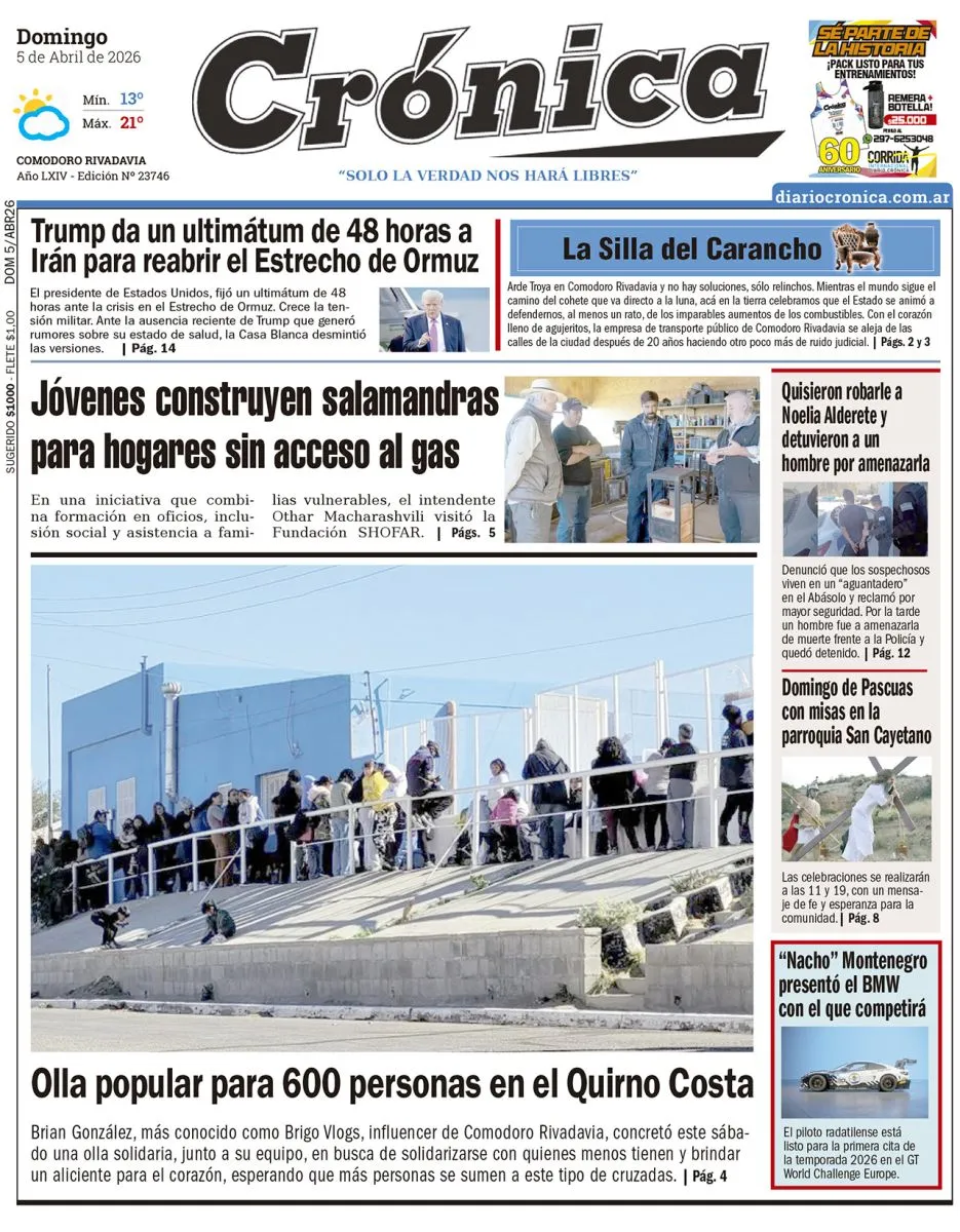 Actualidad Domingo 5 de abril de 2026 domingo 05 de abril de 2026 Te puede interesar Hoy sigue la feria de la Agricultura Familiar en el Parque de la Ciudad Torres acompañó el Torneo Patagónico de Newcom en José de San Martín Rawson: La Virgen malvinera realizó una recorrida de fe por distintos barrios de la capital Impulsan charla internacional sobre oportunidades productivas en la Fiesta del Citron en Gaiman Invitan a celebrar el Domingo de Pascua con misas en la parroquia San Cayetano Desde la UCA advierten que la baja en la pobreza es una "ficción metodológica" Un puma apareció en un barco hundido y nadó hasta la costa en Santa Cruz Últimas noticias El Mallorca de Demichelis le ganó al Real Madrid Hoy sigue la feria de la Agricultura Familiar en el Parque de la Ciudad Torres acompañó el Torneo Patagónico de Newcom en José de San Martín Rawson: La Virgen malvinera realizó una recorrida de fe por distintos barrios de la capital Impulsan charla internacional sobre oportunidades productivas en la Fiesta del Citron en Gaiman