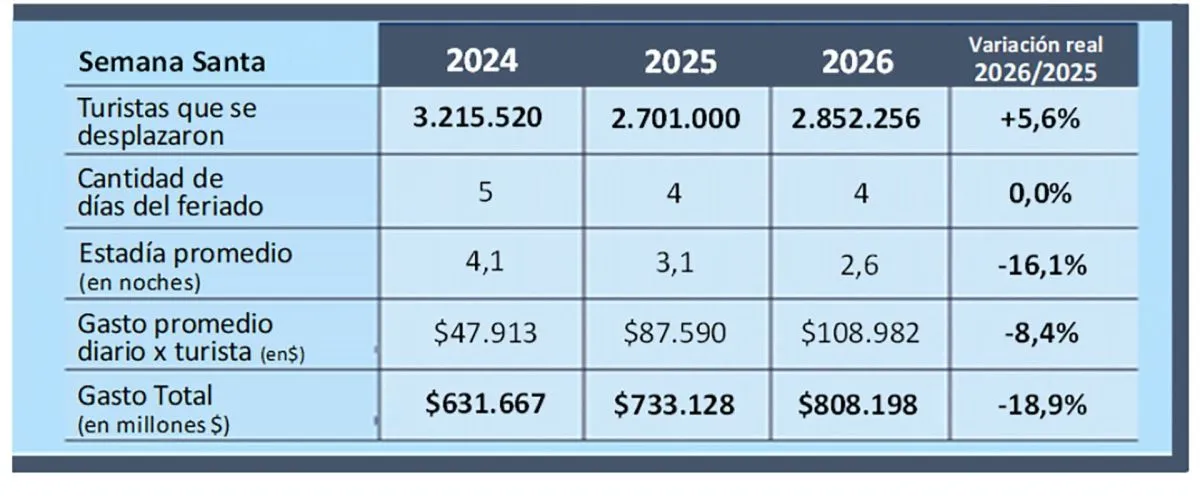 El de Semana Santa fue el tercer fin de semanas largo de 2026, que sumaron casi 6,9 millones de turistas y viajeros, cuyo gasto conjunto superó los 2 billones (millones de millones) de pesos, equivalente a poco menos de USD 1.500 millones.