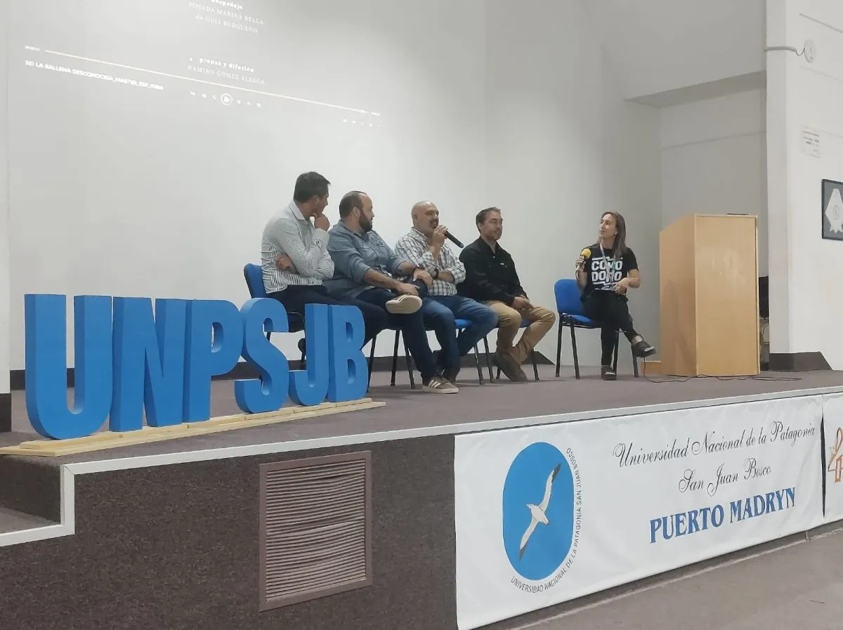 Tras la proyección, se desarrolló un conversatorio con panel abierto al público, donde se abordaron dudas e inquietudes sobre el potencial de la presencia de la ballena Sei en las costas del Golfo San Jorge.