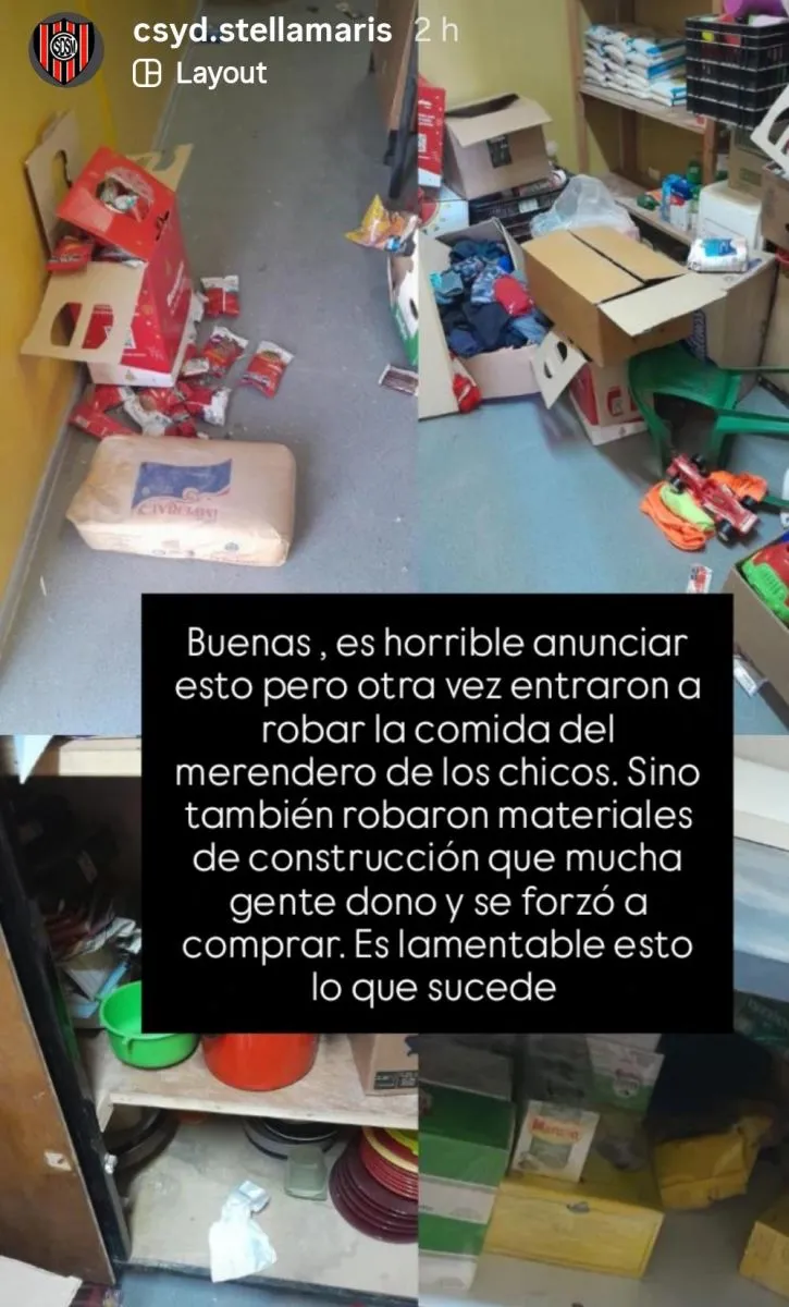 Desde el Club de Zona Sur informaron en sus redes sociales: "Es horrible anunciar esto, pero otra vez entraron a robar la comida del merendero de los chicos".