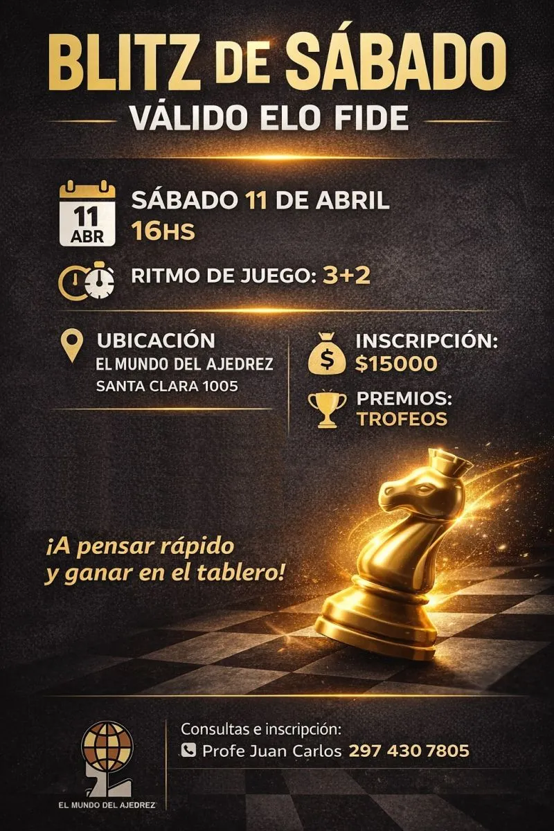 Asimismo, este sábado habrá un torneo blitz válido al ranking internacional. Será a las 16:00 en El Mundo del Ajedrez y la inscripción costará $15 000. Para consultas, pueden comunicarse con Juan Carlos al 2974307805.