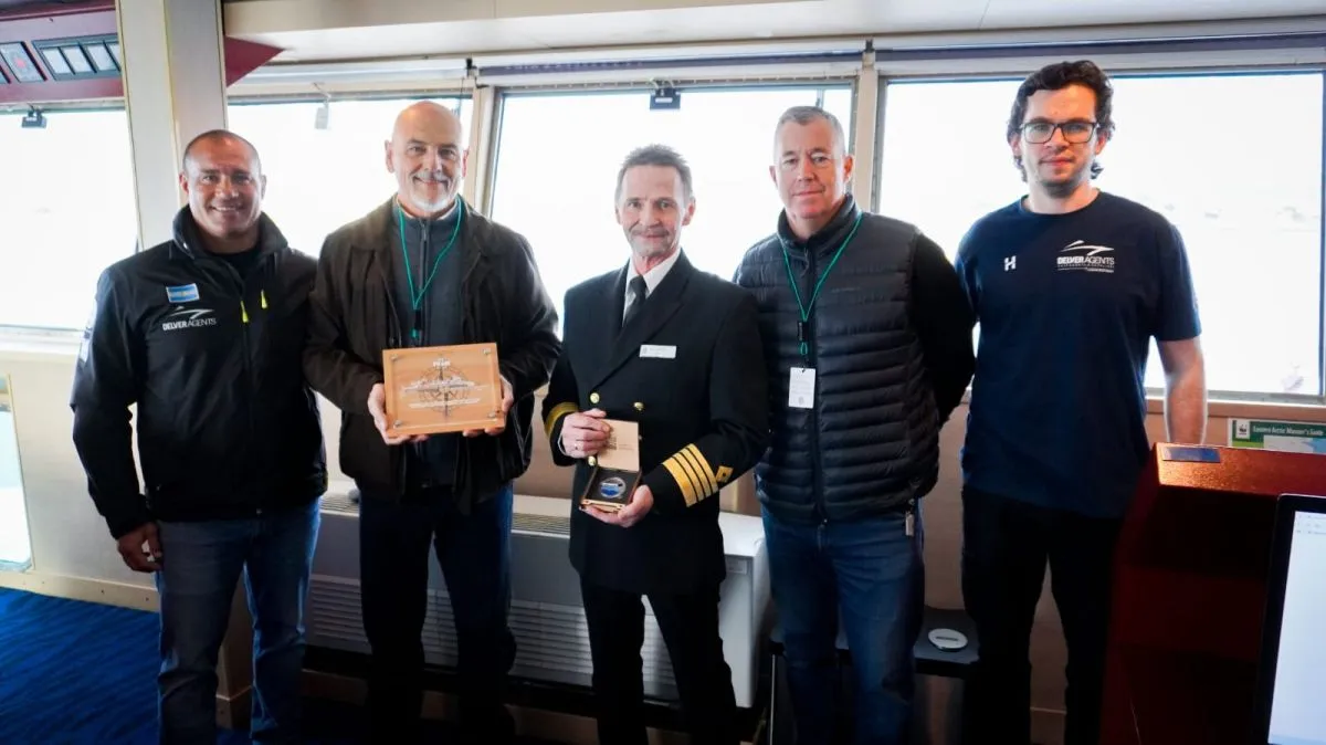 En el marco del fin de la temporada, el titular de la Administración Portuaria de Puerto Madryn (APPM), Sergio Bustos, junto al Director Operativo, Martín Liendo, y representantes de la agencia marítima Delver Agents, fueron recibidos a bordo por el capitán del buque que arribó proveniente de las Islas Malvinas y tiene previsto zarpar a las 17 horas con destino al puerto de Buenos Aires.