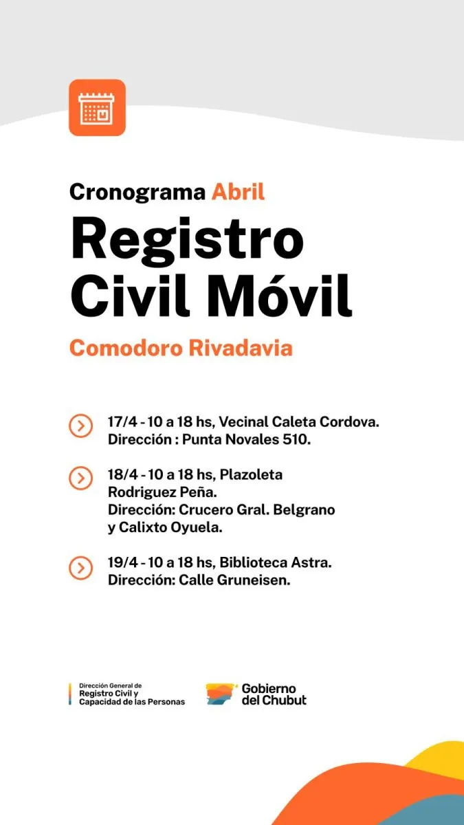 El Gobierno del Chubut informó que, a partir de la próxima semana, la Unidad Móvil del Registro Civil estará presente en distintos barrios de Comodoro Rivadavia, facilitando a los vecinos la realización de trámites de documentación sin necesidad de trasladarse a las oficinas centrales.