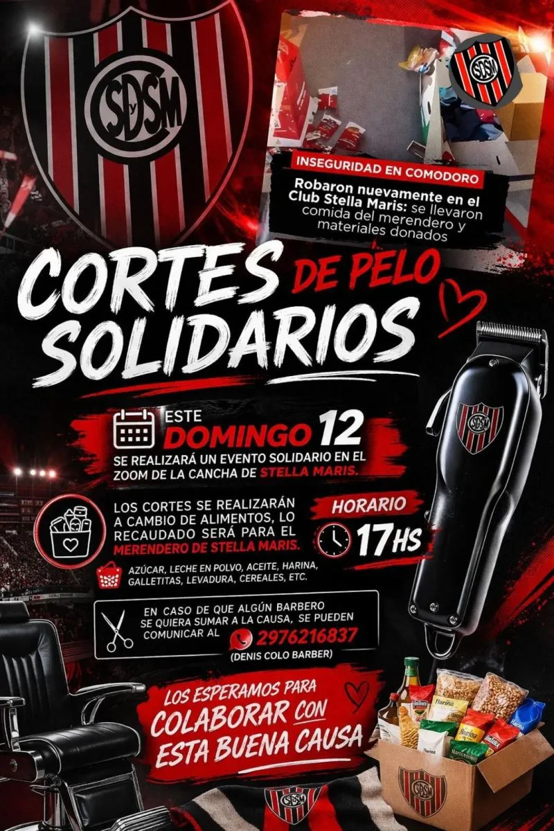 Denis Haro es jugador del Club Deportivo Stella Maris de Comodoro Rivadavia y también barbero. Debido a lo sucedido en las instalaciones de la institución, que sufrió un robo donde funciona el merendero que asiste a decenas de chicos del club, decidió iniciar una cruzada solidaria.