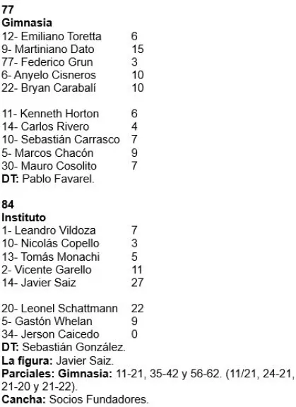 Gimnasia llegó a colocarse a dos, pero no lo puede dar vuelta. Repite desde afuera con los triples pero no llega al 30%. En el cordobés apareció Schattmann. En 4 min del cuarto cuarto se impone Instituto 70 a 63.