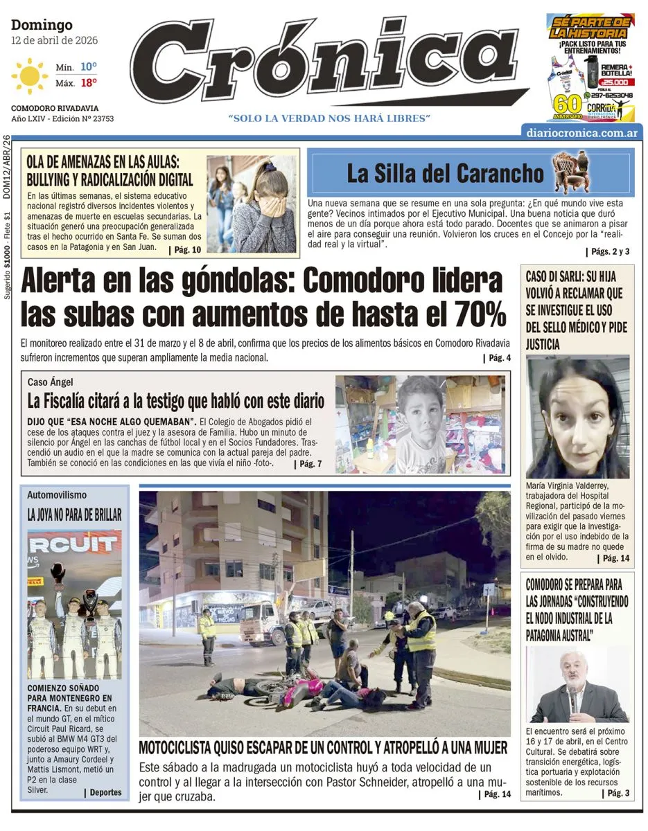 Actualidad Domingo 12 de abril de 2026 domingo 12 de abril de 2026 Te puede interesar Estados Unidos e Irán tuvieron las primeras dos reuniones en busca de un acuerdo de paz y siguen las charlas Crisis en Flybondi: la empresa no pagó sueldos y suspende vuelos al sur Omar Rodríguez fue distinguido como el Fiscal del Año a nivel nacional La Fiscalía citará a la testigo que habló con este diario y dijo que "esa noche algo quemaban" Un futbolista gritó “bomba” en un avión y fue detenido antes del despegue Trump relativizó un acuerdo con Irán en medio de las negociaciones de paz Sin acuerdo con el SOMU, advierten que no iniciará la temporada de langostino Últimas noticias Policía del Chubut desbarata una red de narcomenudeo en la Comarca Andina Comienzo soñado para Montenegro en Francia Estados Unidos e Irán tuvieron las primeras dos reuniones en busca de un acuerdo de paz y siguen las charlas El ISSyS llevó adelante un nuevo taller de alfabetización digital para afiliados y retirados de la Policía El Bibliomóvil sigue recorriendo Chubut y cerró marzo en Aldea Beleiro y Ricardo Rojas