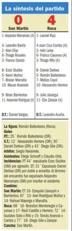 Desde el arranque, Roca tomó el protagonismo y no lo soltó en ningún momento. Aun con el viento en contra durante la primera etapa, el conjunto visitante mostró determinación, intensidad y una idea clara de juego, frente a un San Martín desordenado, sin reacción y con escasas herramientas para inquietar.