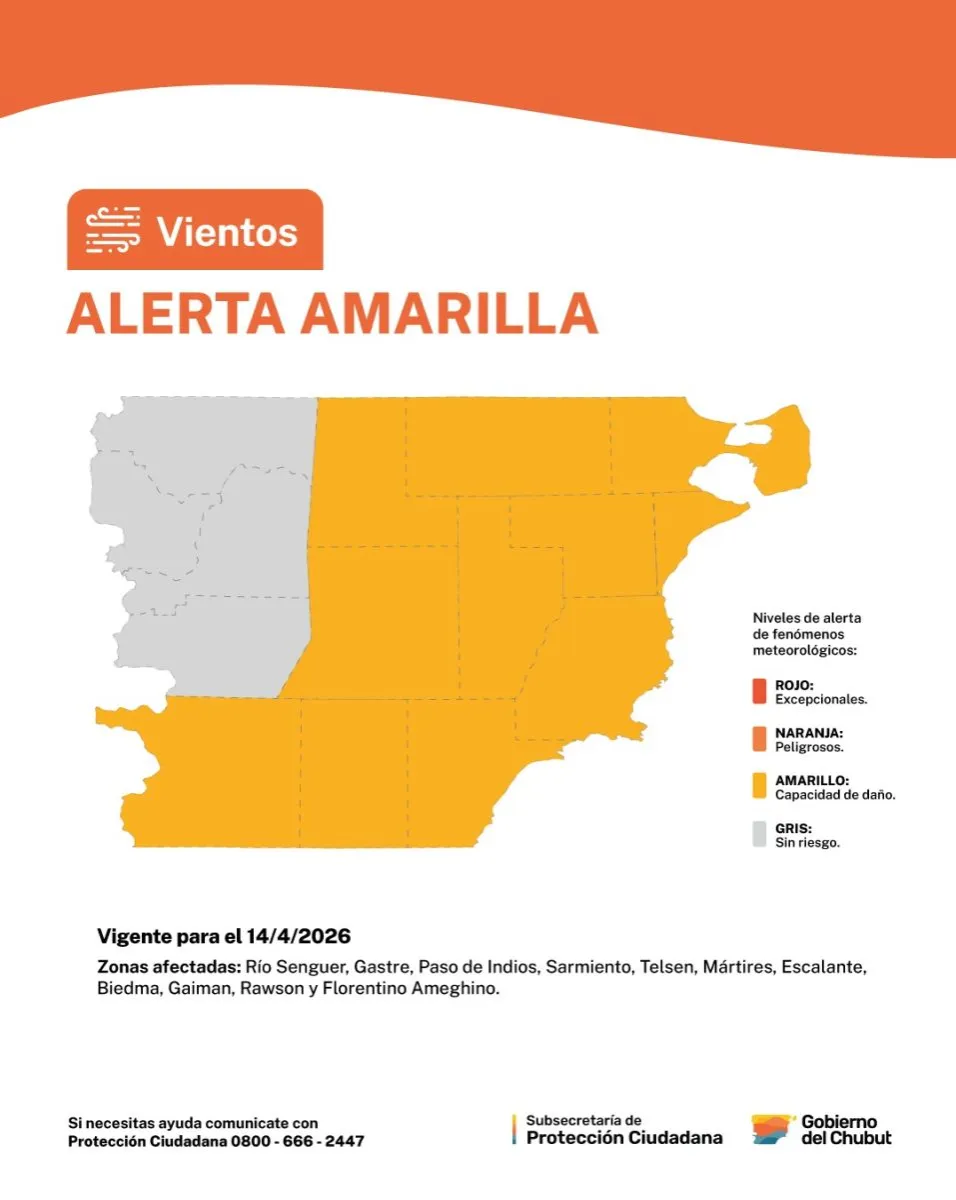 El Servicio Meteorológico Nacional emitió una alerta amarilla por vientos que afectará a varias localidades de Chubut durante la madrugada y hasta el mediodía de este martes 14 de abril.