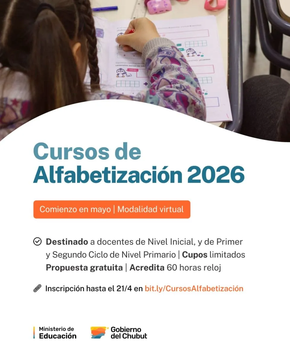 El Gobierno del Chubut, a través del Ministerio de Educación, informa que se encuentran abiertas las inscripciones a las capacitaciones correspondientes al Plan Provincial de Alfabetización “Chubut Aprende”, una política educativa estratégica orientada a fortalecer el desarrollo de las competencias de lectura y escritura en todos los niveles del sistema educativo.