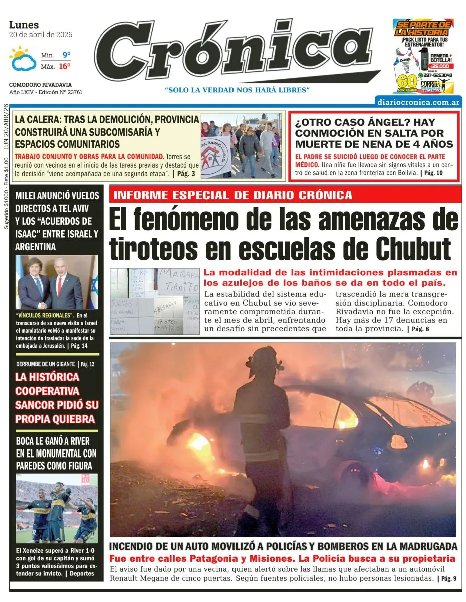 Actualidad Lunes 20 de abril de 2026 lunes 20 de abril de 2026 Te puede interesar Prefectura sorprende a un buque portugués pescando ilegalmente frente a Cabo Dos Bahías en Chubut El Gobierno refuerza su presencia territorial dando respuestas a adjudicatarios de viviendas en Río Mayo y Sarmiento El Gobierno provincial fortalece la concientización vial en escuelas Tras la demolición de la calera, la Provincia construirá una subcomisaría y espacios comunitarios en Trelew Estados Unidos interceptó un buque de Irán en el Golfo de Omán Un fatal ataque de perros Bull Terrier terminó con la vida de un hombre en Puerto Madryn El fenómeno de las amenazas de tiroteos en Chubut: ¿Qué ocurre en los colegios? Últimas noticias Prefectura sorprende a un buque portugués pescando ilegalmente frente a Cabo Dos Bahías en Chubut El Gobierno refuerza su presencia territorial dando respuestas a adjudicatarios de viviendas en Río Mayo y Sarmiento El Gobierno provincial fortalece la concientización vial en escuelas Más de 500 personas celebraron la identidad folclórica en el 2° Encuentro de Peñeros Tras la demolición de la calera, la Provincia construirá una subcomisaría y espacios comunitarios en Trelew Estados Unidos interceptó un buque de Irán en el Golfo de Omán