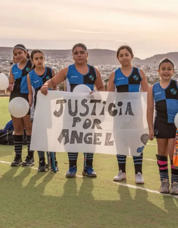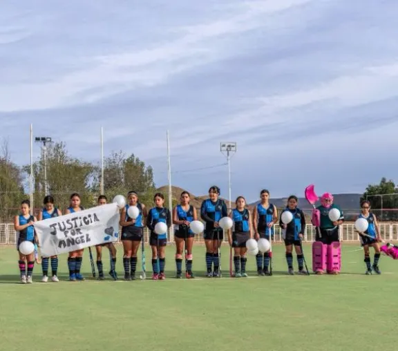 Durante el ingreso al campo de juego, las pequeñas deportistas de Sub 12 y Sub 14 portaron globos blancos y carteles con el pedido de Justicia por Ángel, enfatizando además la importancia de resguardar los derechos de los niños.