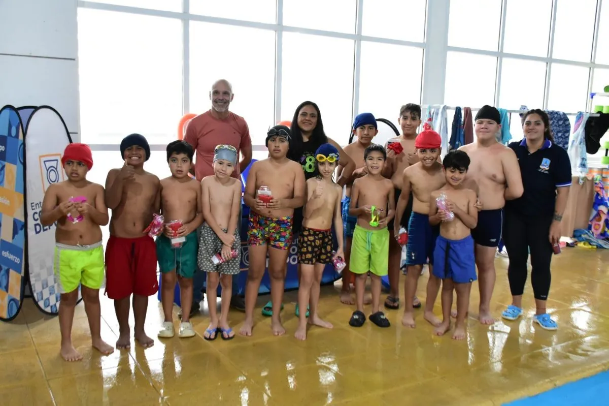 La autoridad de la cartera deportiva, junto con profesores y coordinadores entregaron kits de natación que incluyen antiparras, accesorios y gorritos para los más pequeños.