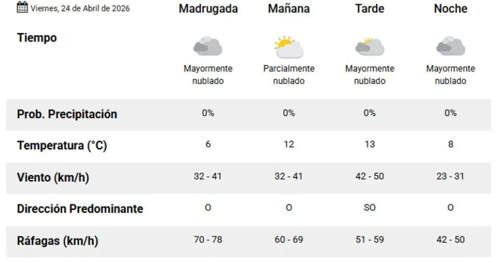 El viernes 24 de abril la mínima será de 6 grados y la máxima de 13 grados. El viento iniciará con ráfagas de 78 kilómetros por hora y descenderá gradualmente hacia la noche.