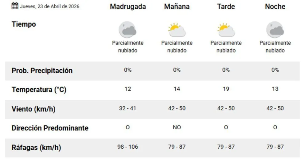 Durante la madrugada, la temperatura mínima se ubicará en 12 grados. Se prevén ráfagas intensas con velocidades estimadas entre los 98 y 106 kilómetros por hora.