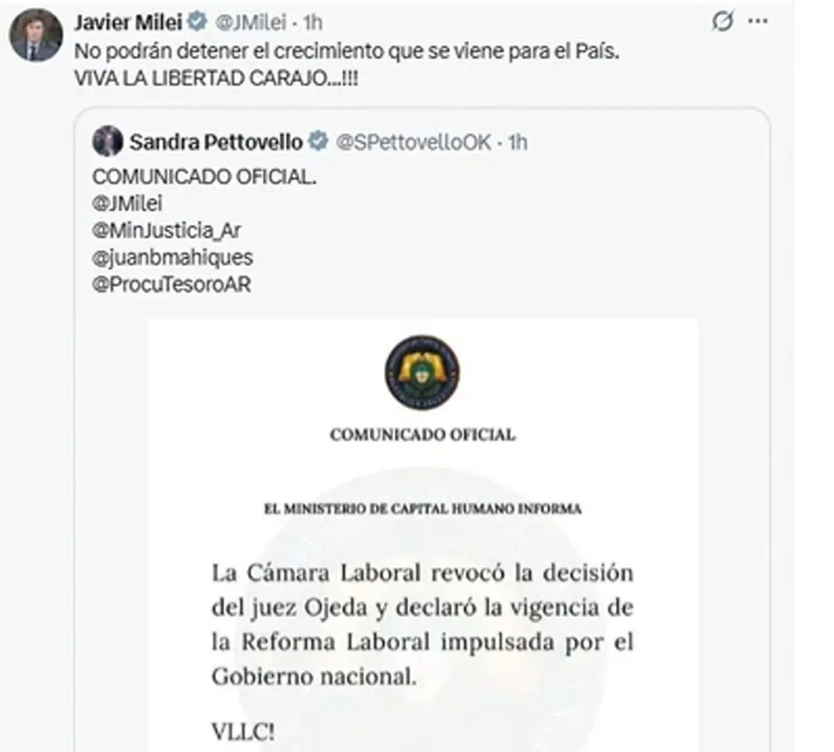El presidente Javier Milei celebró la noticia a través de sus canales oficiales, asegurando que la medida es clave para el crecimiento económico. Por su parte, la ministra de Capital Humano, Sandra Pettovello, ratificó la necesidad de aplicar estas reformas para modernizar el sistema productivo y el mercado de empleo.