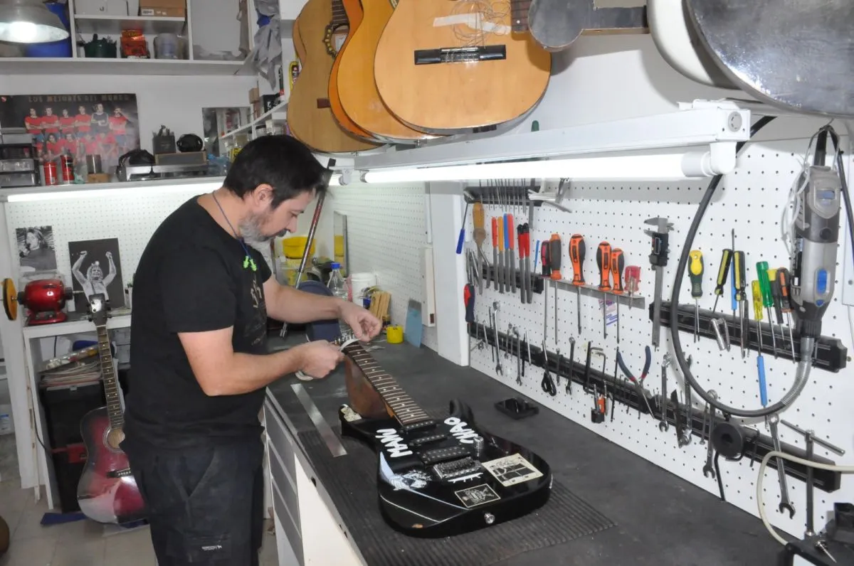 "Lo que más odiaba en la escuela era limar toda la mañana una piecita; hoy, es lo que hago todos los días. Esa formación técnica te da un oficio que, si no lo tenés, se nota en el resultado final", reflexiona Ariel en su taller ubicado en calle Ameghino al 1500 que tiene guitarras colgadas que esperan su atención.