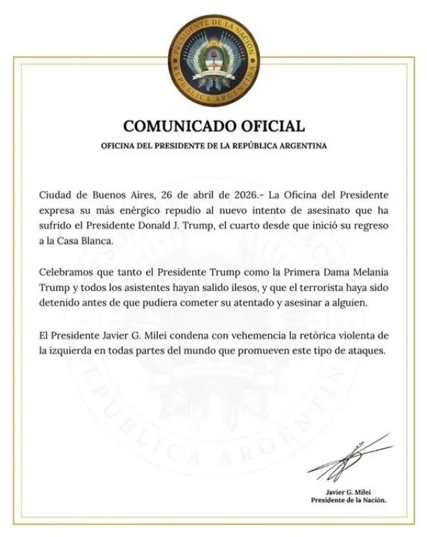 El Gobierno nacional emitió un comunicado para manifestar su más enérgico repudio ante el tiroteo registrado en el hotel Washington Hilton. El hecho ocurrió durante una cena de periodistas en Estados Unidos. La administración argentina apuntó contra la retórica violenta como factor determinante en este tipo de sucesos. Según señalaron desde Casa Rosada, estos discursos alimentan hechos que vulneran la seguridad institucional.