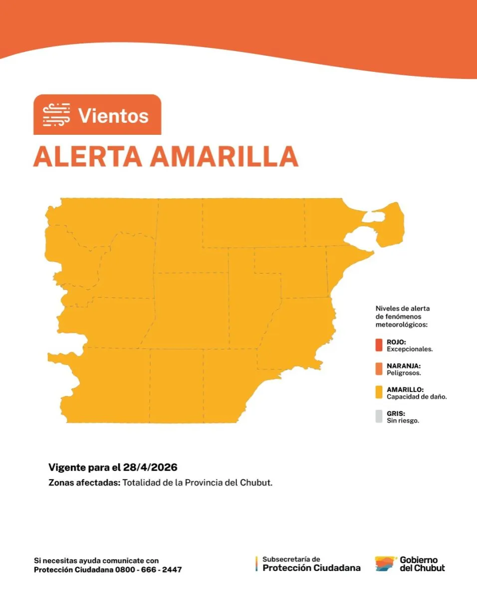 El Servicio Meteorológico Nacional emitió un alerta amarilla por vientos para todo Chubut. La contingencia climática está prevista para la noche de este martes 28 de abril.